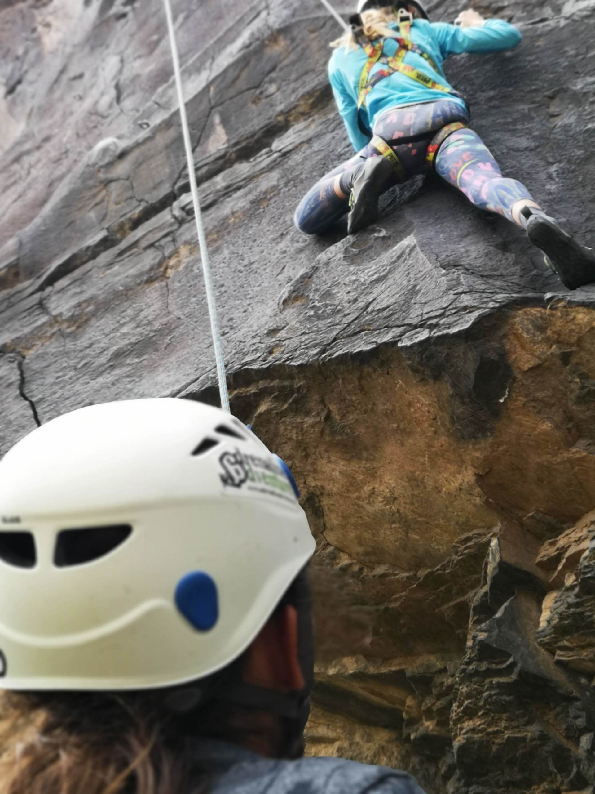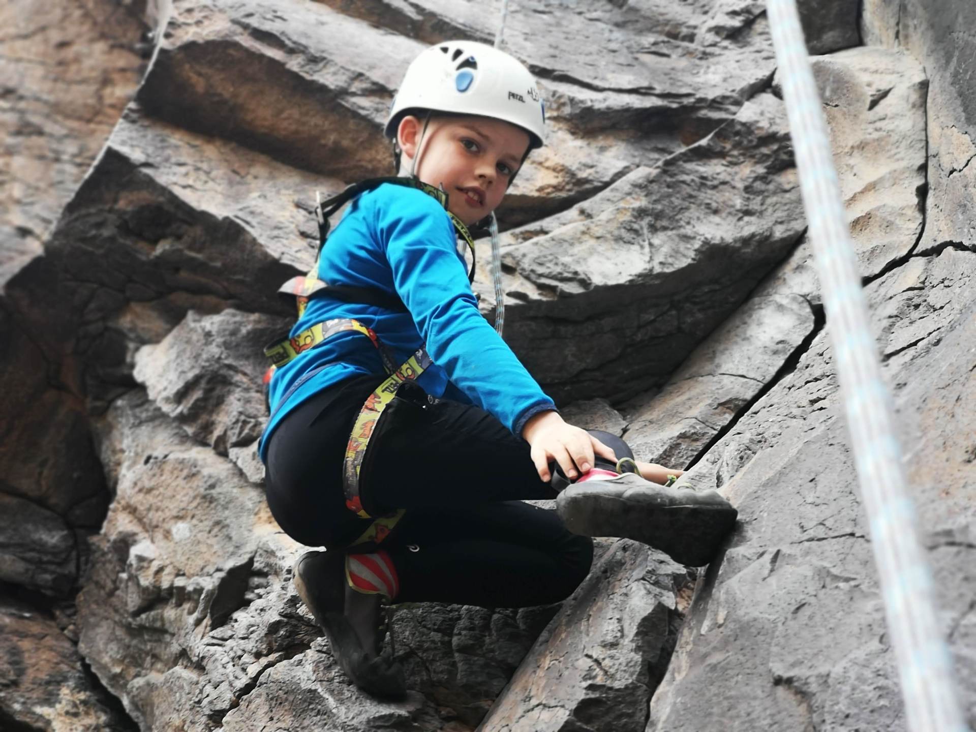 En la escalada treparais, en máxima seguridad, con casco, arnés, cuerda y zapatos especiales (pies de gato). Cada participante escalará con cuerda pasada (top-rope).